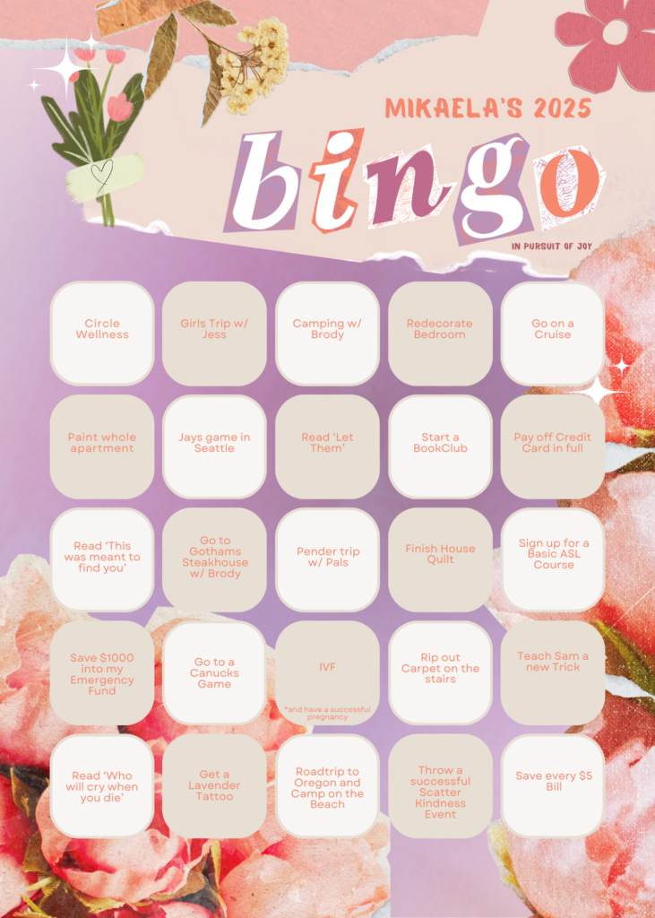 Brody worked on New Years, so I spent it with two of my good friends, and they were doing a 2025 Bingo Card! To make this pursuit of joy more tangible, my 2025 Bingo Card is filled with goals that embody sunshine, healing, and, of course, joy.